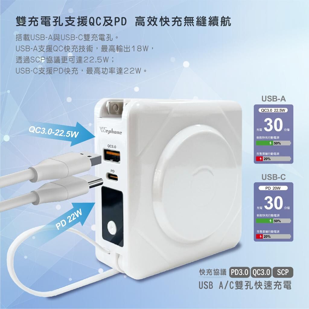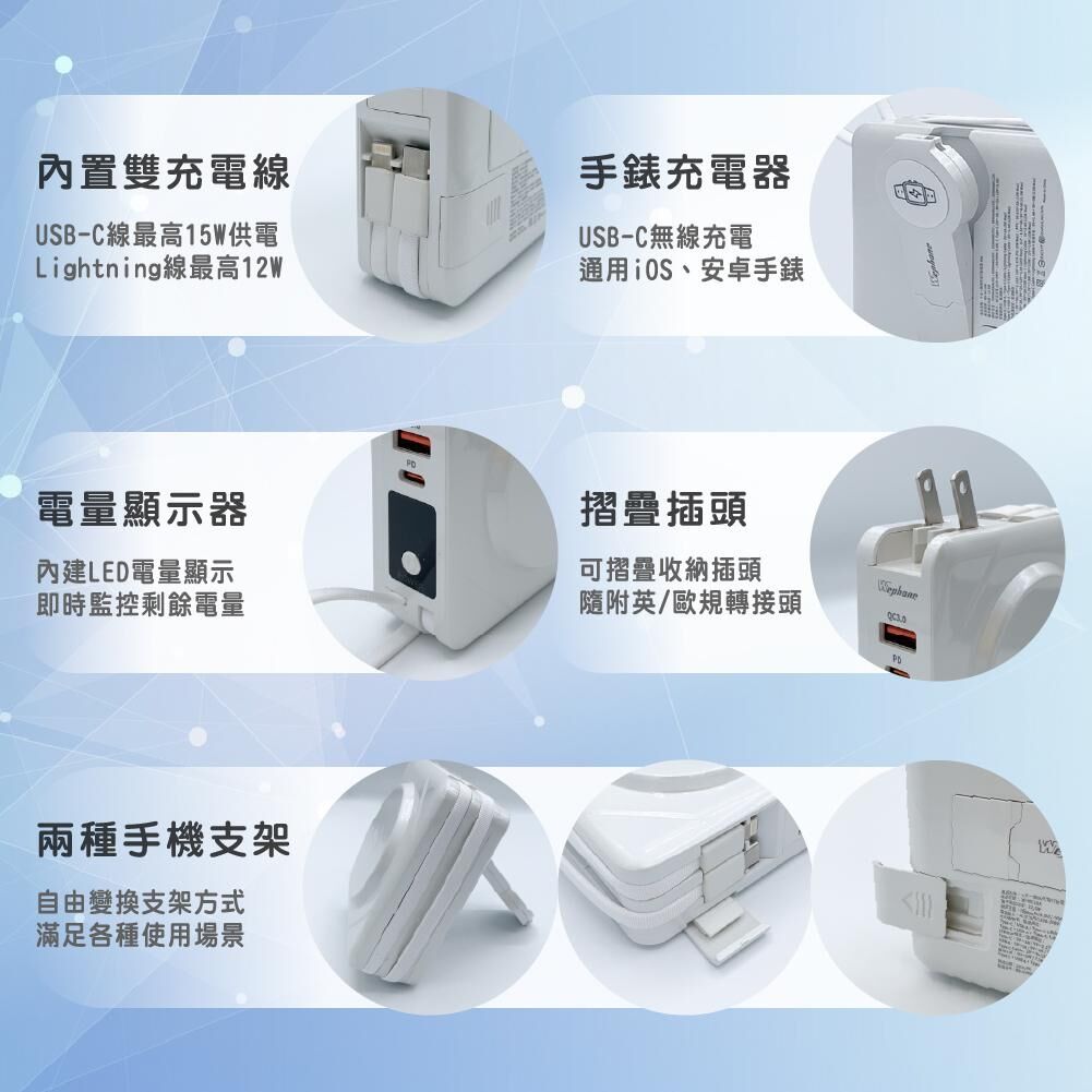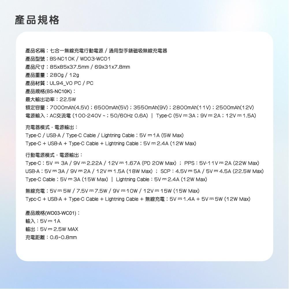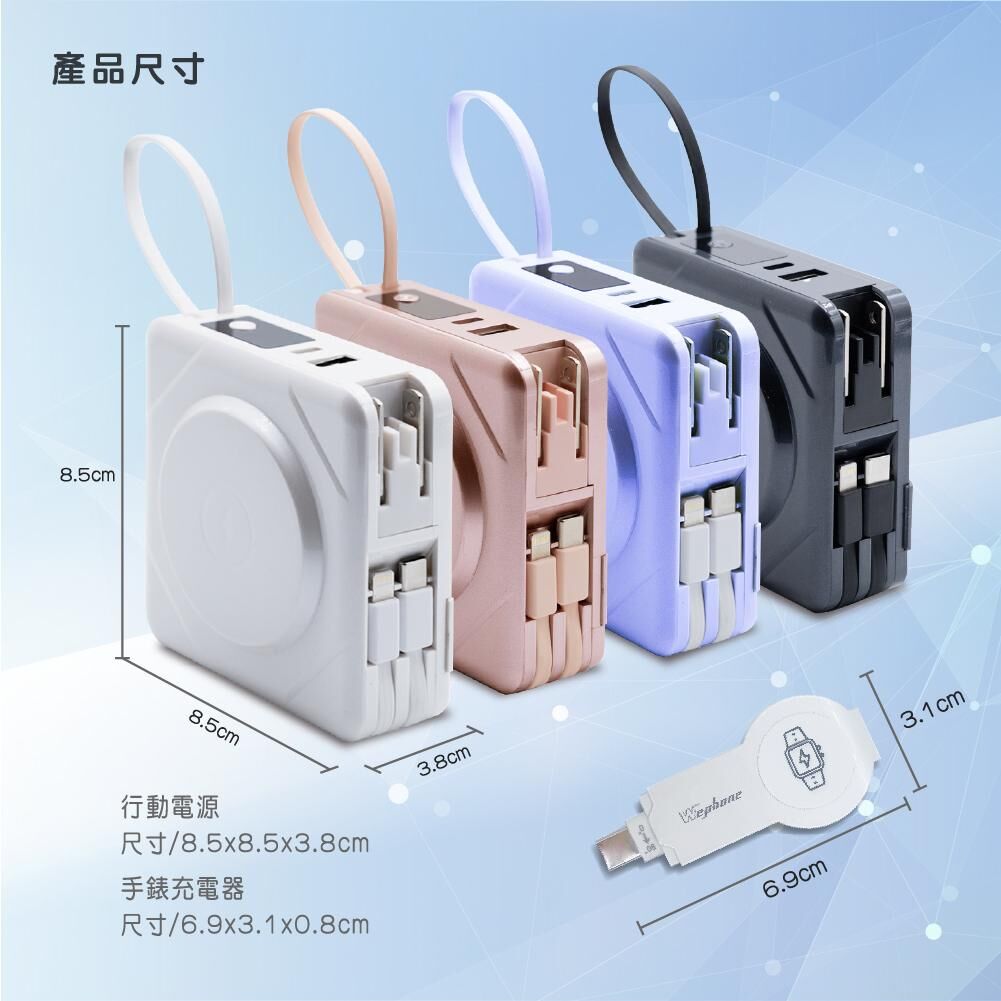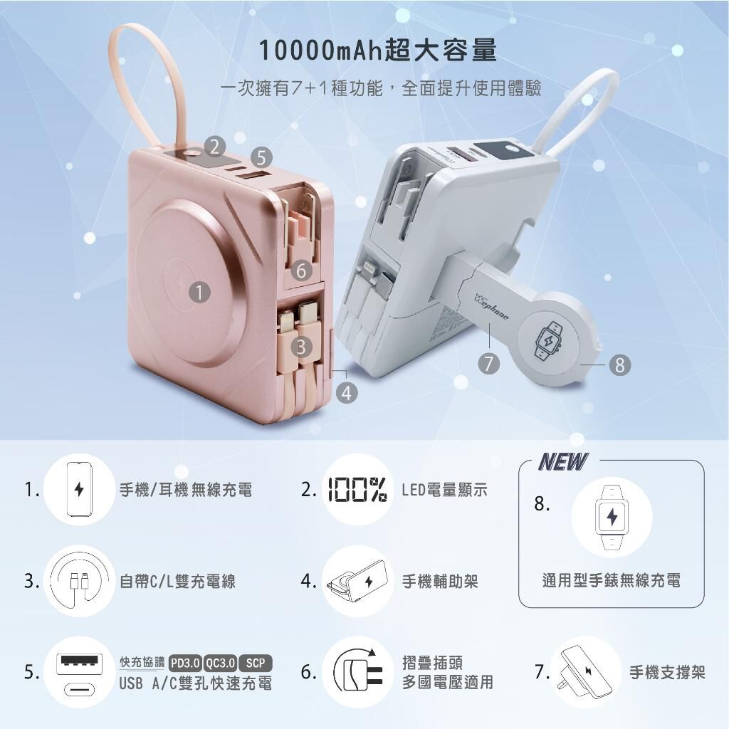 Wephone 10000mAh 7+1 無線充電行動電源,整合手機、手錶等多種充電需求,一顆即可同時為多裝置補電。支援無線充電與多種輸出介面,外出、旅行或日常使用皆便利。通過 BSMI、NCC 安全認證,使用更安心,並附隨身收納袋,收納攜帶更加整齊有型。