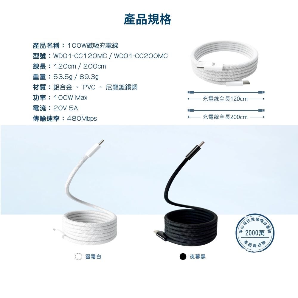 100W 超高速磁吸充電線,穩定吸附不易脫落,支援 PD 快充與高速資料傳輸,日常充電更俐落安心。