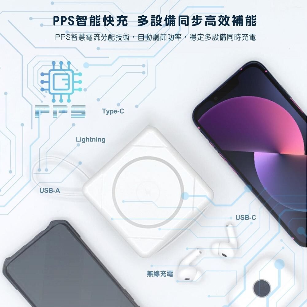 【Wephone】 七合一無線充電行動電源(二代) 集結 無線充電、磁吸快充、自帶充電線、多裝置同時充電 等功能於一身,是外出旅行、日常通勤、緊急補電的最佳萬用充電夥伴。支援多種充電方式,體積輕巧、攜帶便利,一顆即可搞定手機、耳機、平板多裝置充電需求。