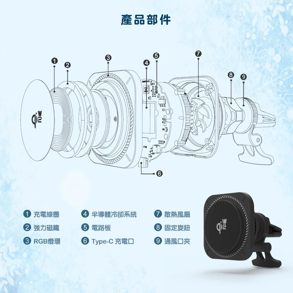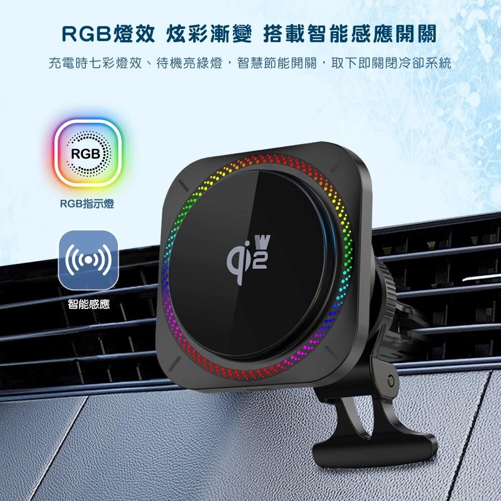 內建 半導體製冷系統與散熱風扇,有效降低充電溫度,維持穩定效能;搭配 炫酷 RGB 彩燈,為車內增添科技感與氛圍感。適用多款智慧型手機,行車充電快速又安心。
