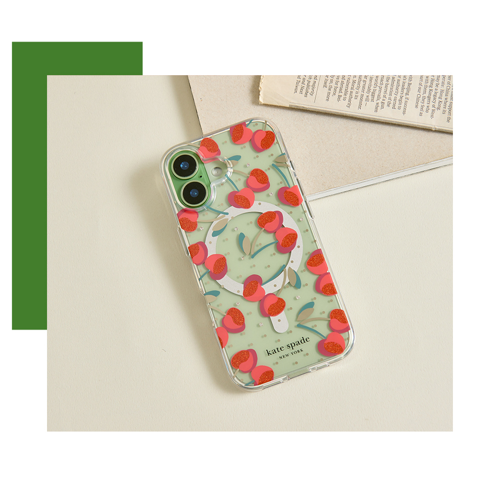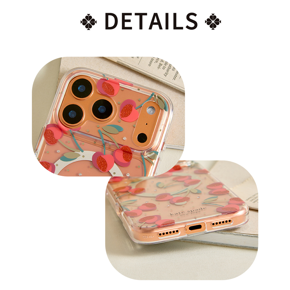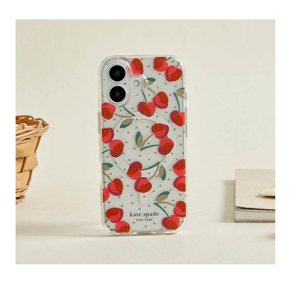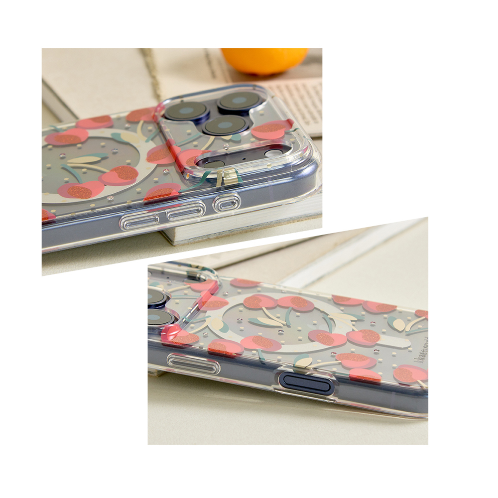 這款「嬌豔櫻桃」設計,將晶亮飽滿的櫻桃圖騰灑落於透明殼面,