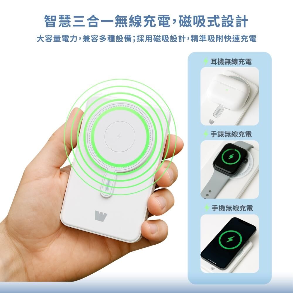 Wephone 5合1磁吸無線行動電源 將磁吸、無線充電、PD快充、有線輸出、自帶線與手機支架完美整合,一顆即可滿足日常通勤、外出旅行、多裝置充電等各種情境需求,是你最萬用的隨身充電夥伴。