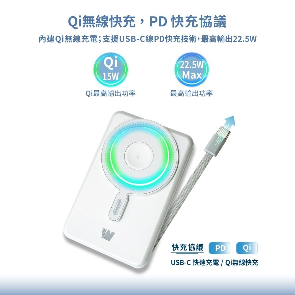 支援 MagSafe磁吸,一吸即充、牢固不滑落;同時具備 Qi 無線充電 與 PD高速有線輸出,可為多裝置快速補電。