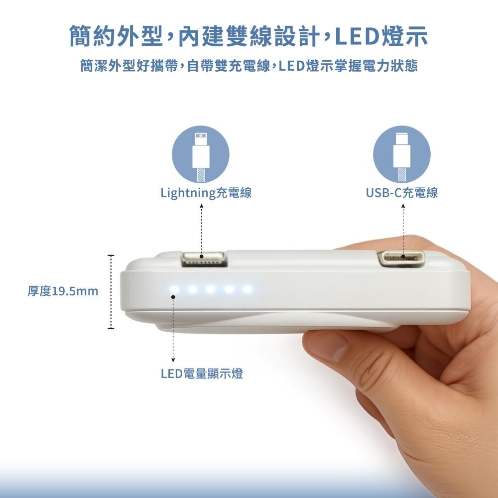 提供 5000mAh 與 10000mAh 兩種容量選擇,滿足通勤、旅行、長時間外出的不同需求。