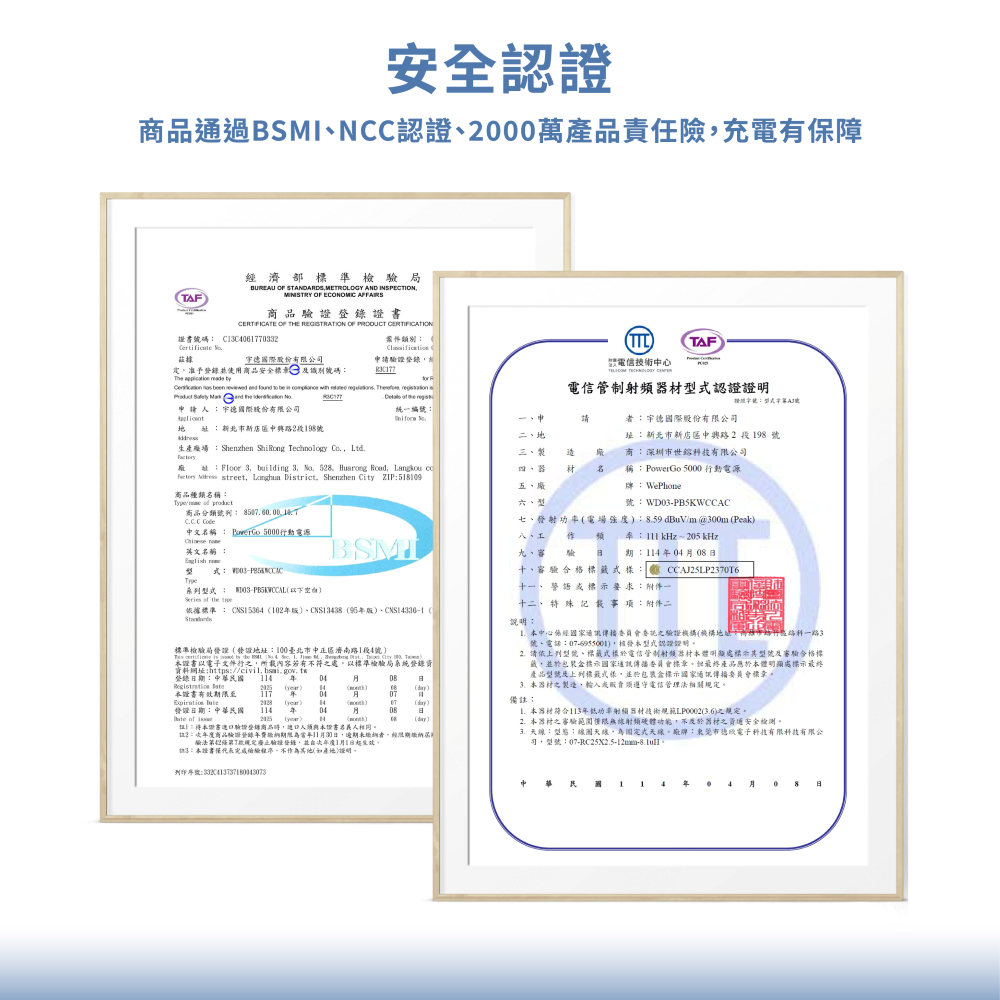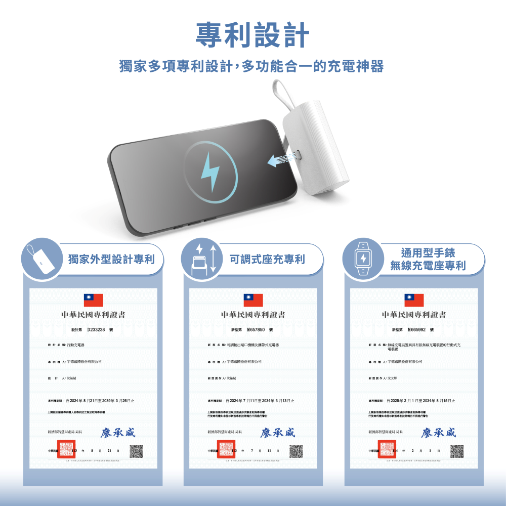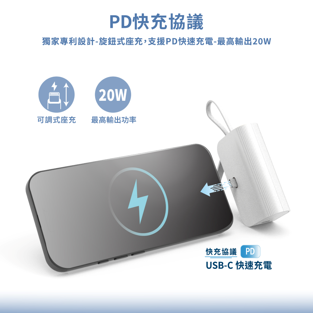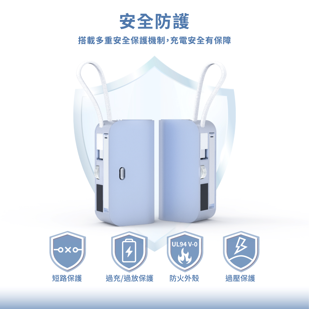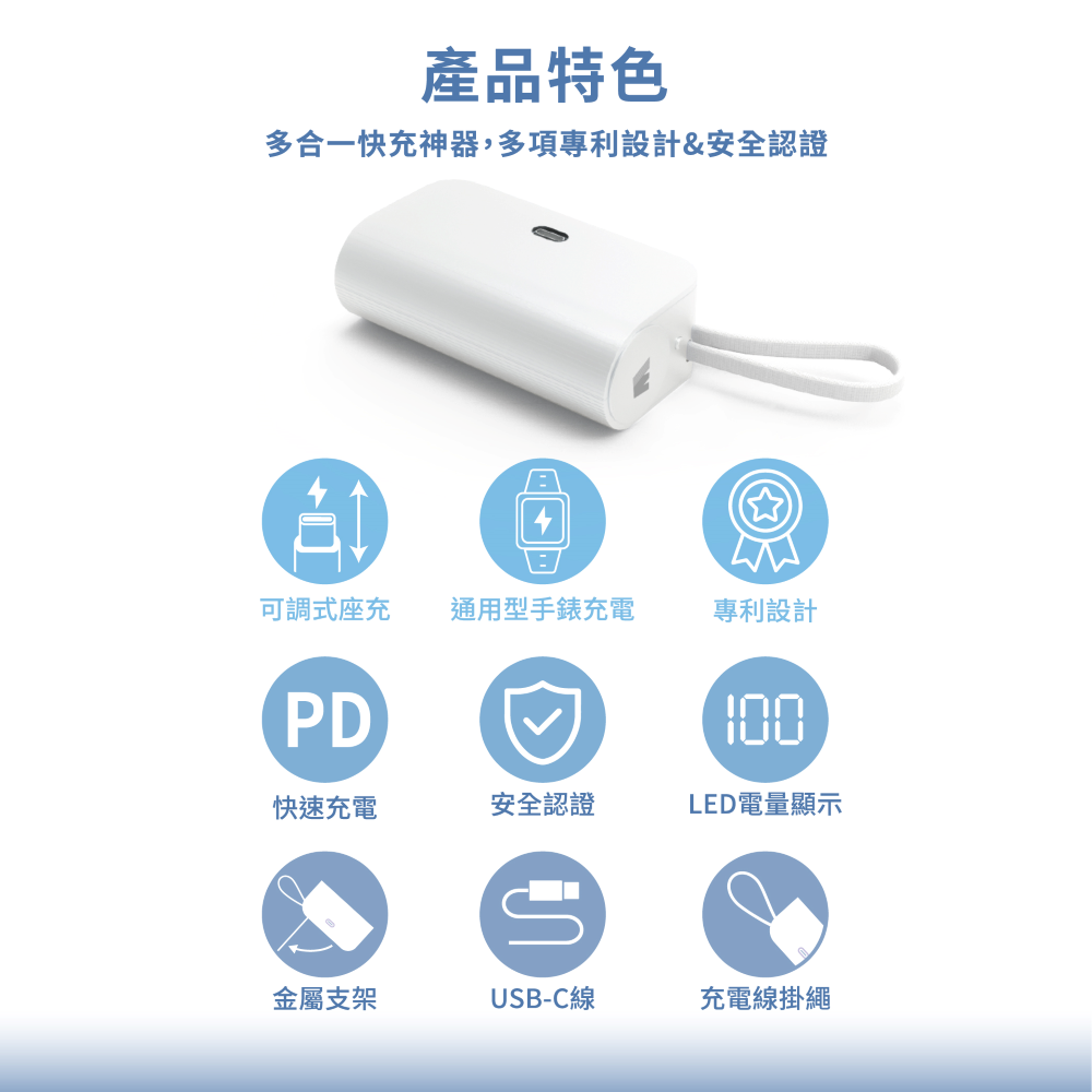5000mAh 容量適合作為日常備用電力,可同時為手機、耳機、智慧手錶補電不間斷。通過 BSMI 安全認證,具備多重保護機制,使用更安心便利。