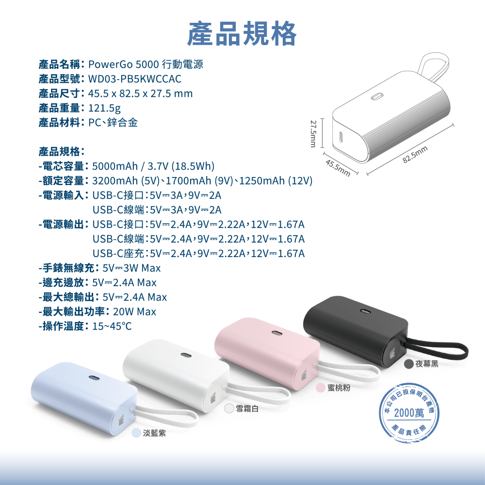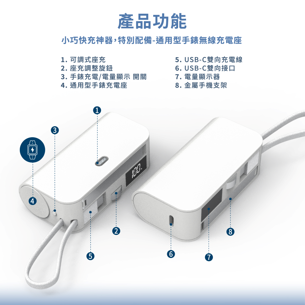 Wephone PowerGo 5000 多功能行動電源 集 PD快充、USB-C雙向輸入輸出、智慧手錶充電、多裝置補電 於一機,輕巧好攜帶,是日常通勤與旅行必備的萬能小電源。